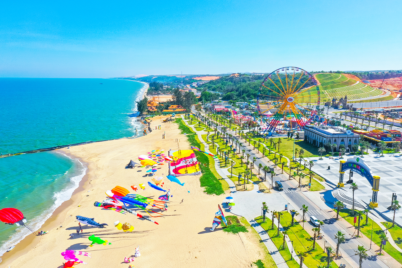 10h30: Đến Phan Thiết, xe đưa quý khách đến check-in tại BÃI BIỂN BIKINI BEACH NOVA WORLD PHAN THIẾT, là điểm check-in mới tại Phan Thiết đã đi vào hoạt động và được người dân cũng như du khách đặc biệt yêu thích với góc chụp hình hấp dẫn, các biểu tượng độc đáo như tượng happy boy-girl, cổng cầu vòng, nhà gỗ, khung chụp ảnh, logo Bikini Beach ngay tại bãi biển…